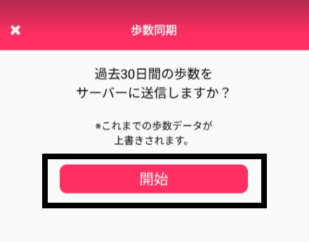 過去30日間の歩数をサーバーに送信しますか?[開始]をタップ