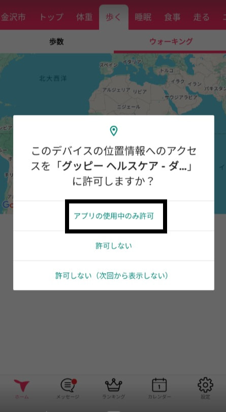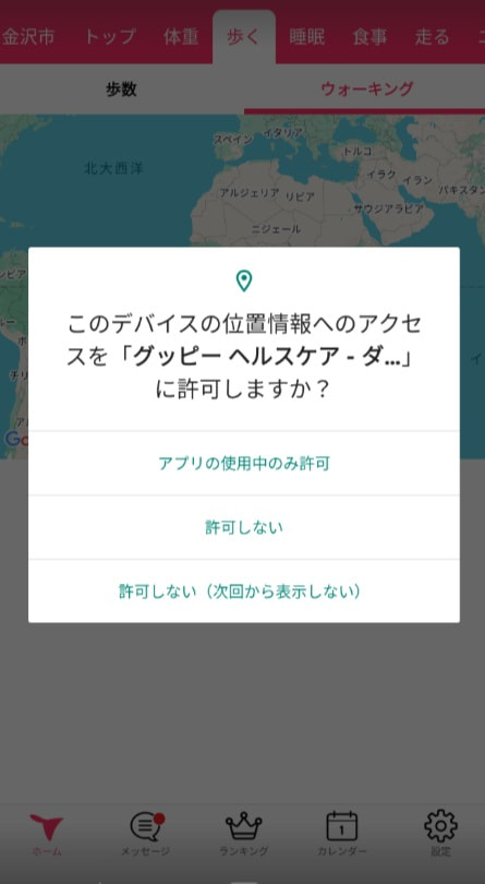 1. 位置情報の許可がされていない場合、ウォーキング・ランニング・サイクリングのタブを開くと「位置情報を許可しますか?」という画面が表示されます