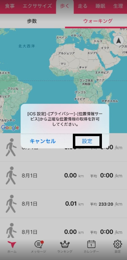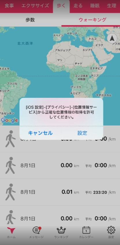 1. 位置情報の許可がされていない場合、ウォーキング・ランニング・サイクリングのタブを開くと「正確な位置情報の取得を許可してください。」という画面が表示されます