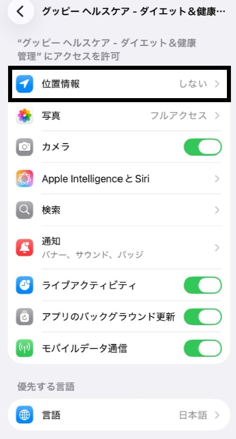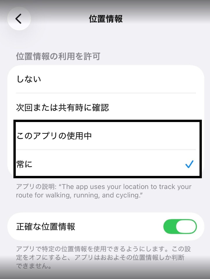 「位置情報」が、”しない”に設定されていると、ウォーキング・ランニング・サイクリングの記録が行えません