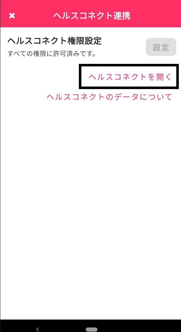 ③ヘルスコネクト連携画面にて「ヘルスコネクトを開く」をタップ
