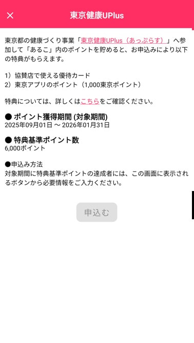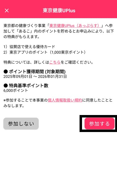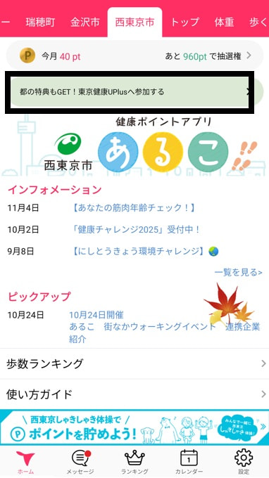 1.【西東京市】タブ内ポイントバナー下の「都の特典もGET!東京健康UPlusへ参加する」をタップ